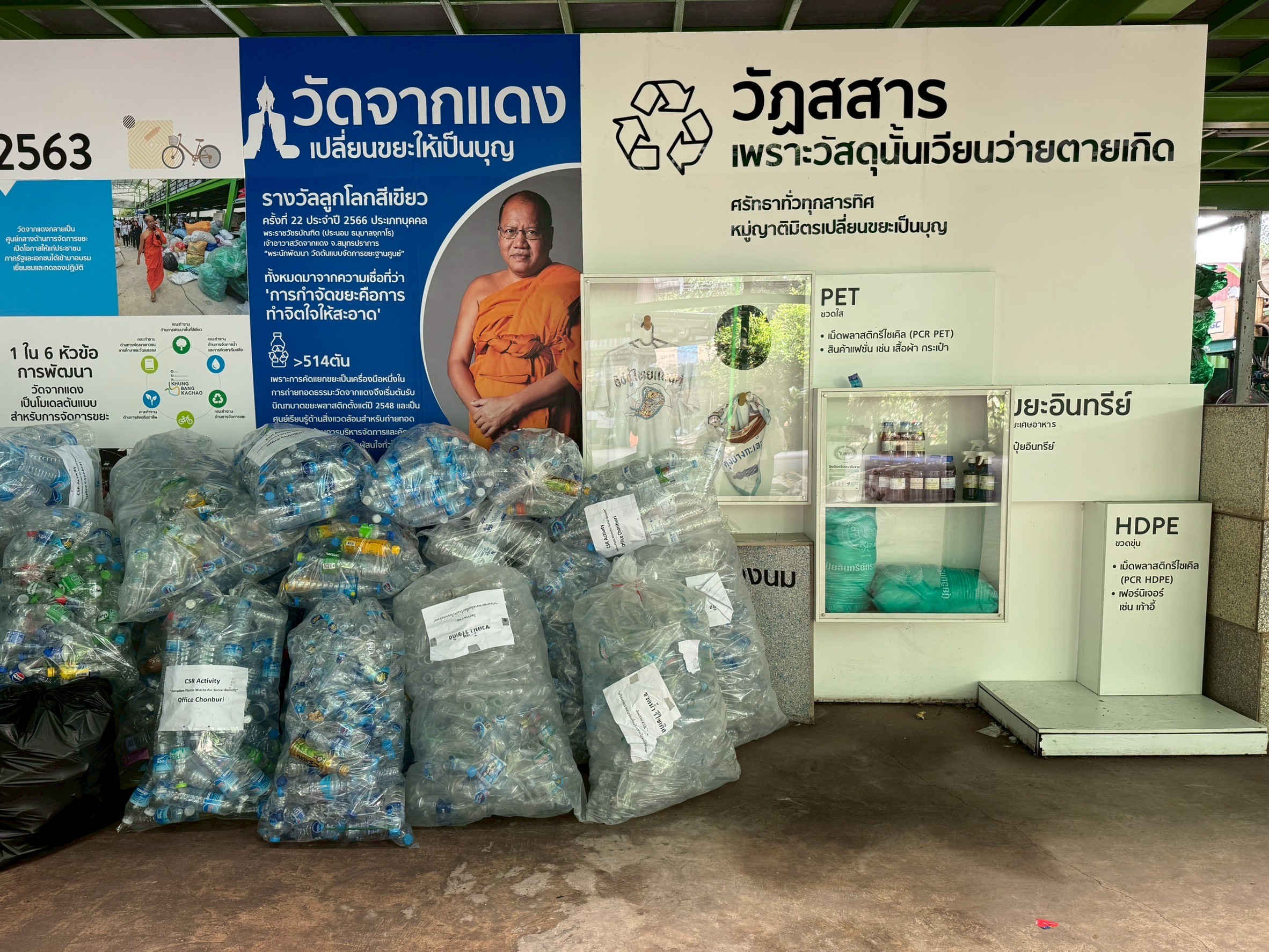 บริษัทฯ เห็นถึงปัญหาขยะพลาสติกในองค์กร จึงได้เชิญชวนพนักงานให้นำขวดพลาสติด (PET) ที่ใช้แล้วมาทำความสะอาดและรวบรวมเพื่อนำไปบริจาคให้แก่ วัดจากแดง จังหวัดสมุทรปราการ โดยทางวัดจะทำขวดพลาสติกเหล่านี้เข้าสู่กระบวนการแปรรูปรีไซเคิลเพื่อผลิตเป็นใยสังเคราะห์ และนำไปตัดเย็บเป็นผ้าไตรจีวรให้แก่พระสงฆ์ นอกจากการบริจาคขวดแล้วยังมีกิจกรรม Work shop ให้พนักงานได้ร่วมสนุกกับการระบายสีบนกระเป๋าผ้าอีกด้วย