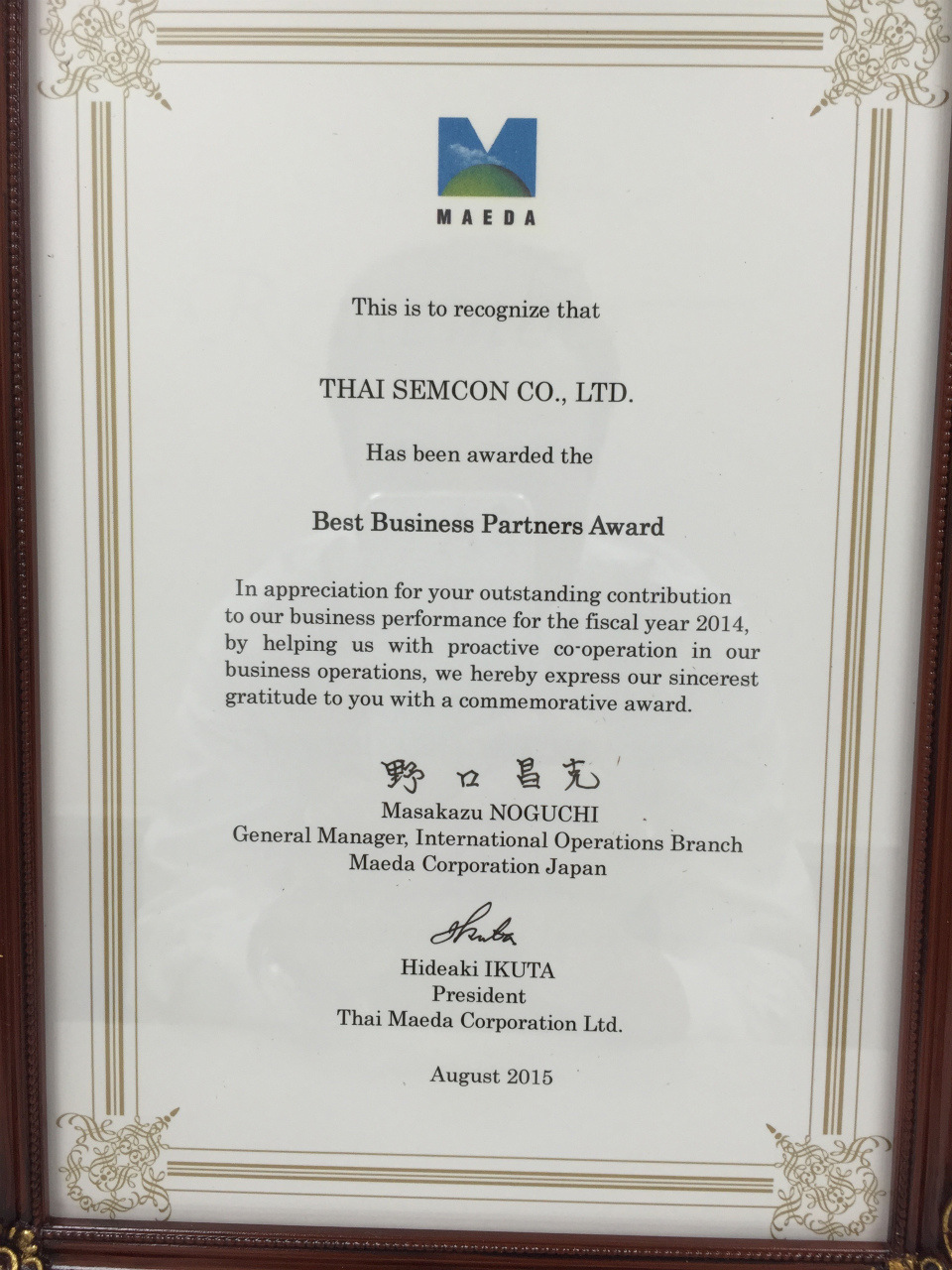 September 3, 2015, Mr.Masakuzu Noguchi. Executive officer of Maeda Corporation presented the Award of best business partners to Thai Semcon. We are proud and very appreciated to get a honour of recognition. We always keep a customer's satisfaction in highest level.